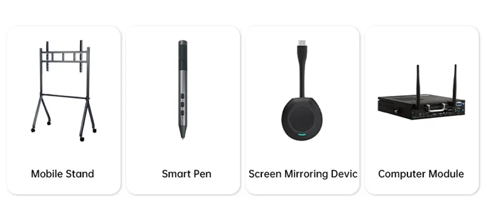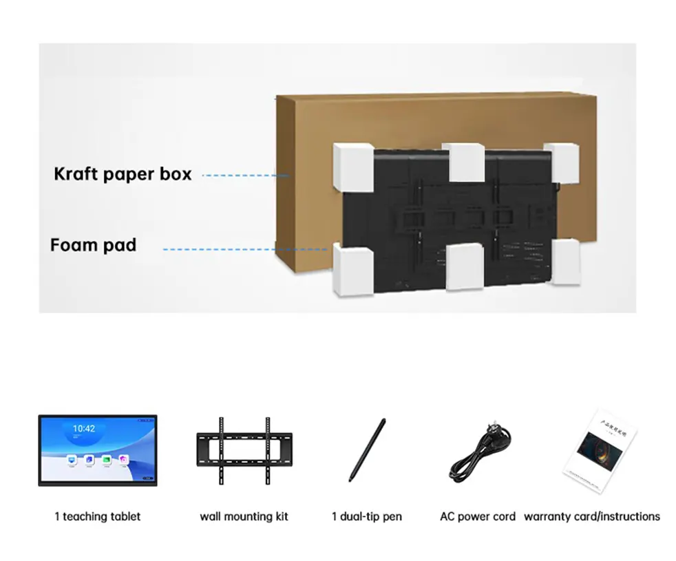 Κάθε διαδραστικός πίνακας της τάξης είναι συσκευασμένος από παχύρρευστο αφρό και στη συνέχεια τοποθετείται σε χαρτοκιβώτιο, με αξεσουάρ από ένα σετ τοίχου βραχίονα, ένα στυλό γραφής, ένα καλώδιο τροφοδοσίας και ένα εγχειρίδιο χρήσης.