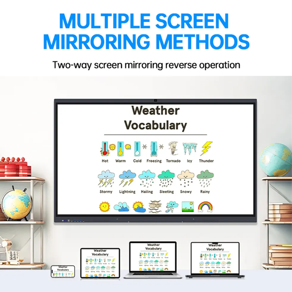 Το Smart Board κάνει την ασύρματη κοινή χρήση απλή. Οι δάσκαλοι και οι μαθητές μπορούν να αντικατοπτρίζουν iPad, iPhone, συσκευές Android ή φορητούς υπολογιστές στην οθόνη χωρίς καλώδια. Πολλοί χρήστες μπορούν να μοιράζονται ταυτόχρονα και οι δάσκαλοι μπορούν να βλέπουν ή να ελέγχουν τις συσκευές των μαθητών απευθείας από τον πίνακα—βολικό για τη διατήρηση των μαθημάτων σε καλό δρόμο και την παροχή σχολίων σε πραγματικό χρόνο.